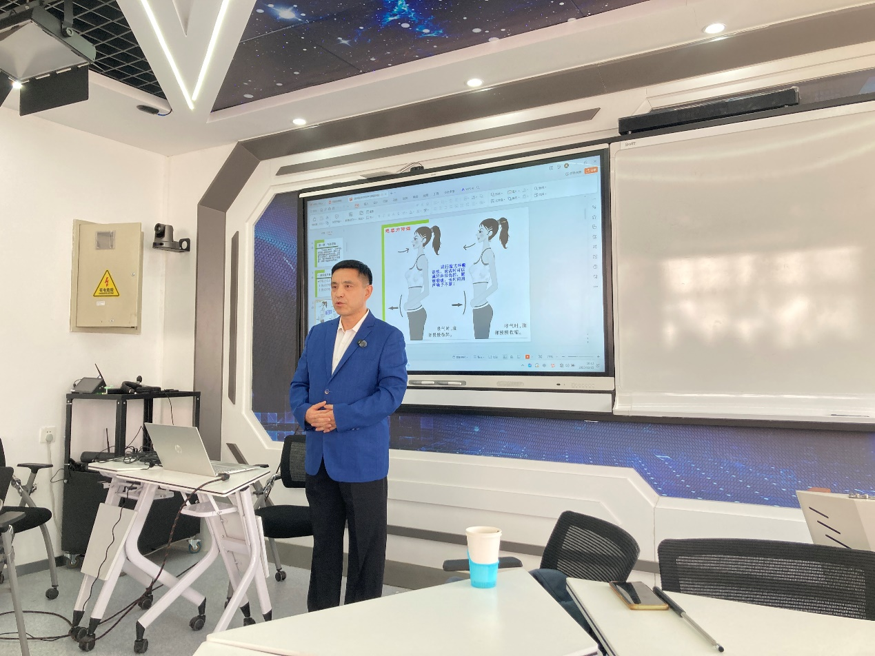 接着,韩老师紧贴教师工作实际,阐述了科学发声的基石——气息控制,重点讲解了腹式呼吸的原理与重要性。韩老师指出,“气者音之帅也”,通过腹式呼吸可以减轻声带负担,实现长时间用声不累。他现场示范了“闻花香”式的慢吸慢呼和“受惊吓”式的快吸慢呼等训练方法,并指导老师们进行体验,让大家深刻体会到气息对声音的支撑作用。